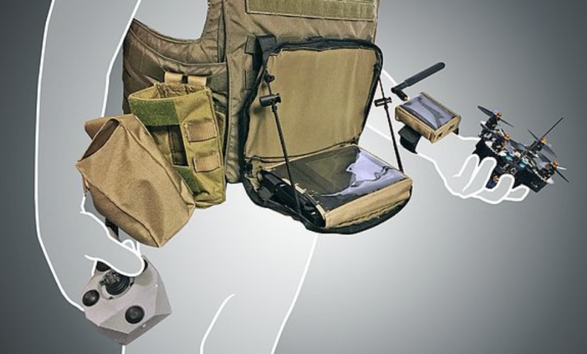 The NanoHawk has been designed to fit the soldiers body-worn equipment. The main monitor is fitted in the armour vest and the one hand controller provides easy control of the platform, as the other hand is always kept on the soldier gun.